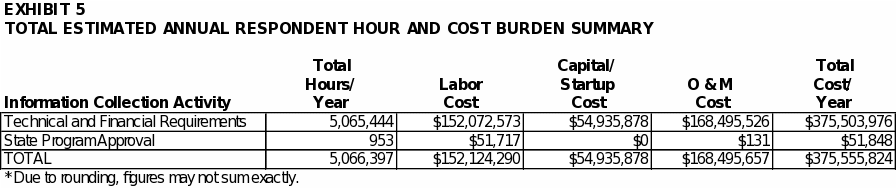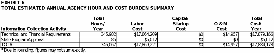 Exhibit 6 summarizes the total annual Agency hour and cost burden associated with all of the requirements covered in this ICR. As shown in the exhibit, EPA estimates the annual Agency burden to be approximately 346,000 hours and $18 million. The bottom line burden to the Agency over three years is estimated to be approximately 1.0 million hours and $54 million.