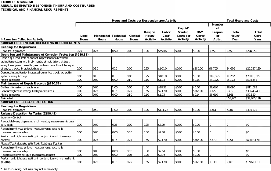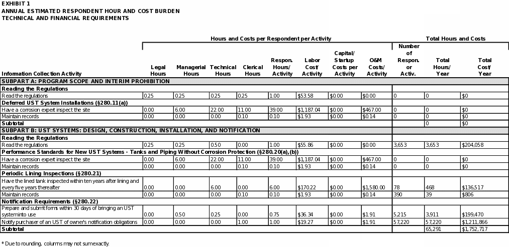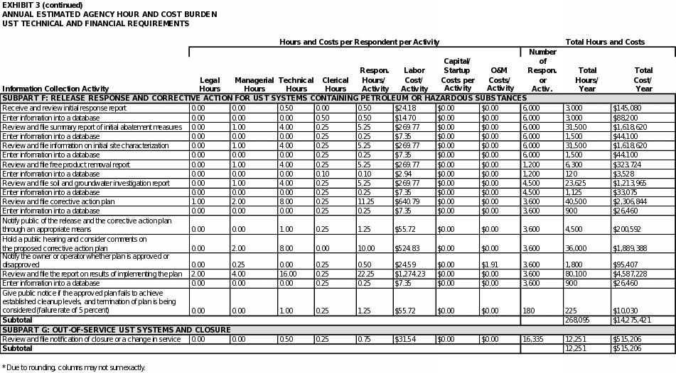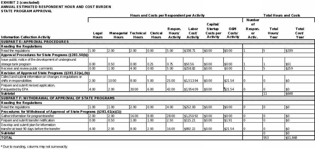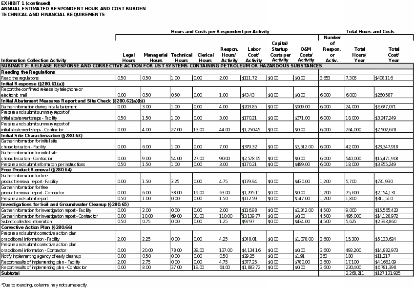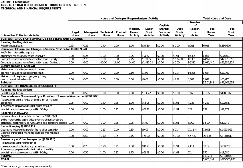 EPA estimates the total annual respondent burden to be about 5 million hours and $376 million for information collection requirements associated with Part 280 and about 950 hours and $52,000 for information collection requirements associated with Part 281. For UST facilities, the estimated total average time burden for conducting the activities covered in this ICR is approximately 24 hours per respondent annually. For states applying for program approval and for states with approved programs, the estimated total average time burden is approximately 23 hours per state annually.