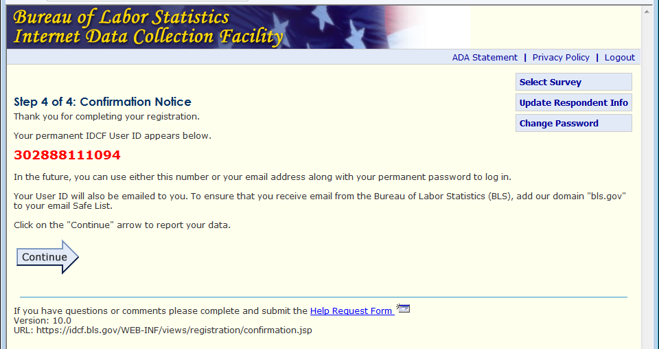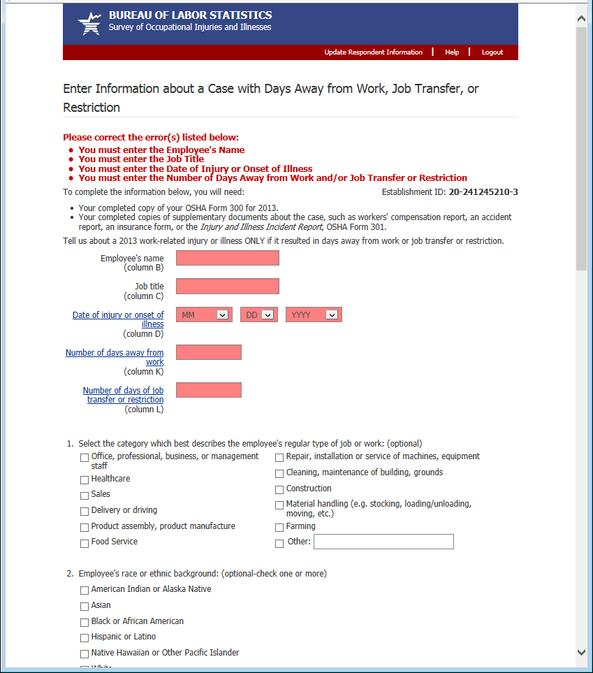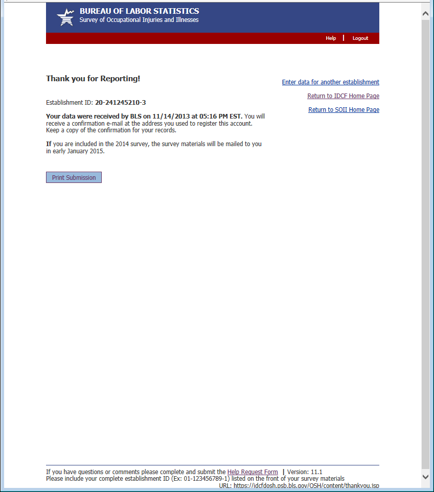 Previously the bottom of each page contained an email address for requesting assistance. Now it contains a link to a help form. This allows us to automatically route the help request to the appropriate party and gives us information about the page and the establishment the respondent was having trouble with. The 2 required fields, email address and phone number, are pre-populated with the information the respondent provided during the registration process.