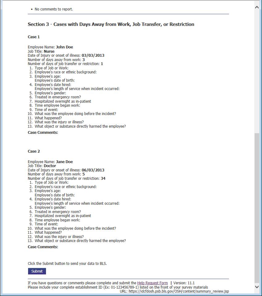 Section 3: Cases with Days Away from Work, Job Transfer, or Restriction