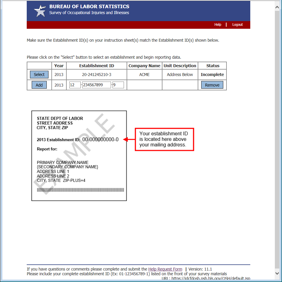 Clicking “Add Establishment” adds a blank row to the establishment table and provides the respondent with an example label indicating where the establishment ID is located on their survey mailing.
