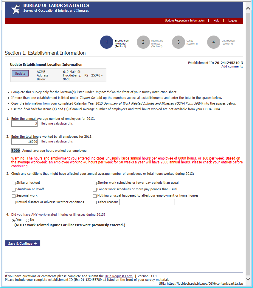 The Section 1 inline warning is a new addition. It is triggered after the respondent enters a combination of employment and hours information that is unusually high or low and is displayed directly below question 2.