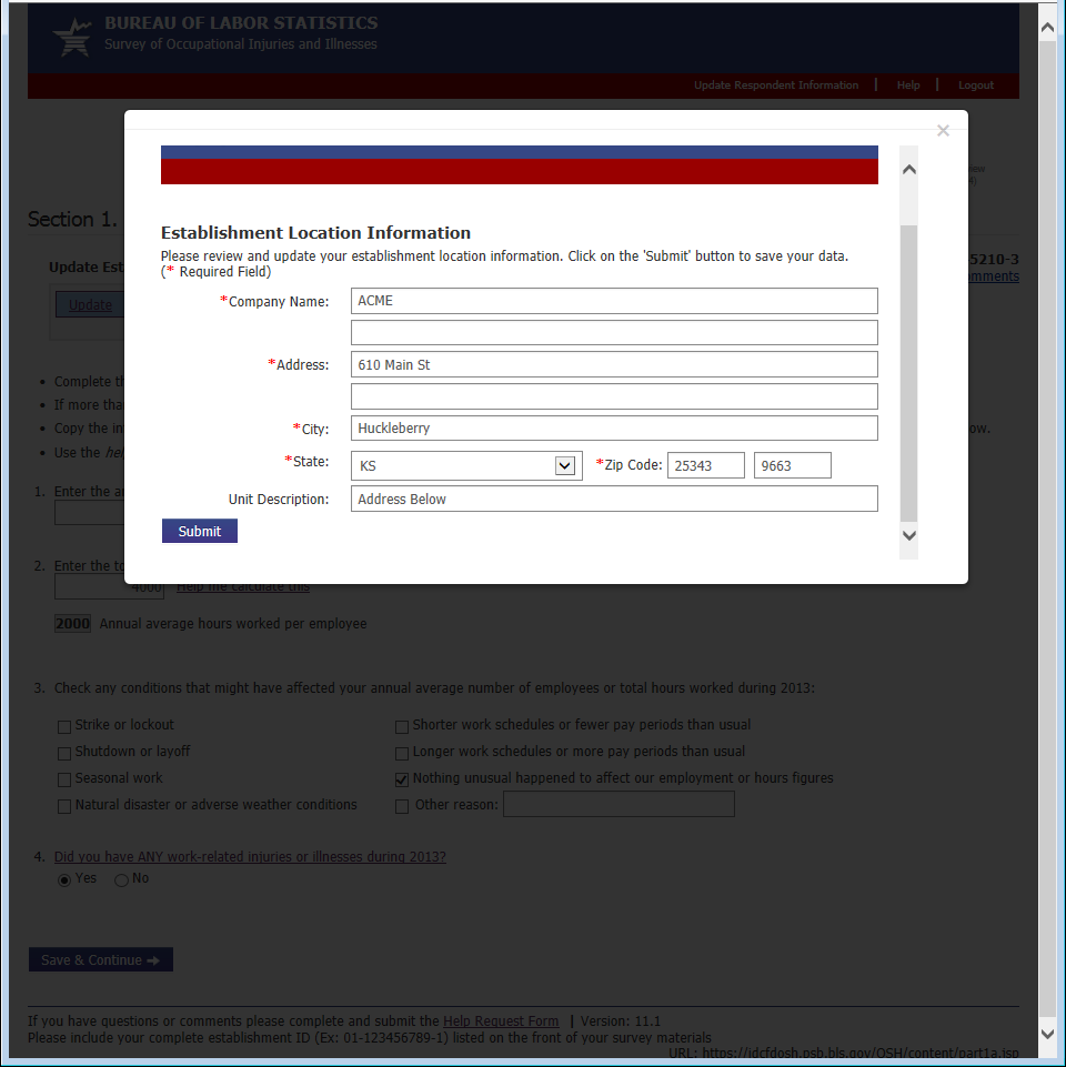 Previously the bottom of each page contained an email address for requesting assistance. Now it contains a link to a help form. This allows us to automatically route the help request to the appropriate party and gives us information about the page and the establishment the respondent was having trouble with. The 2 required fields, email address and phone number, are pre-populated with the information the respondent provided during the registration process.