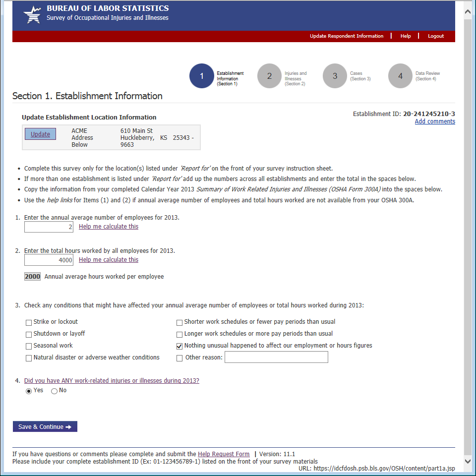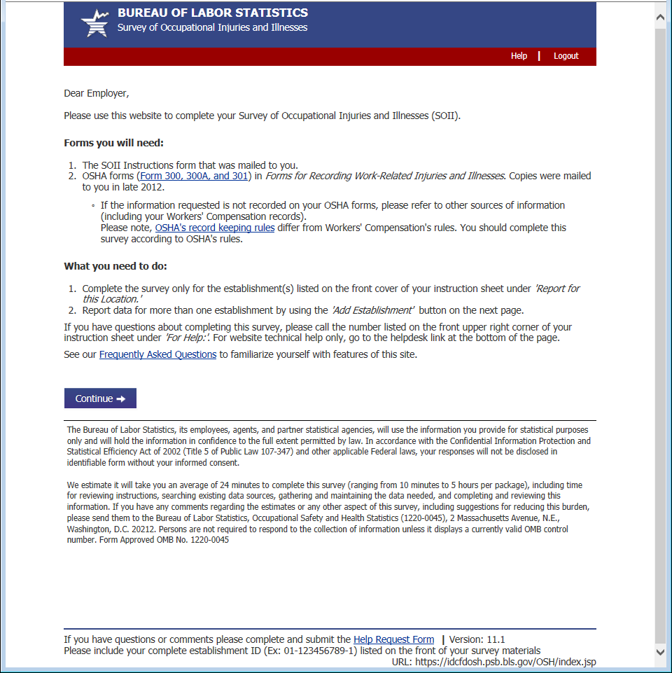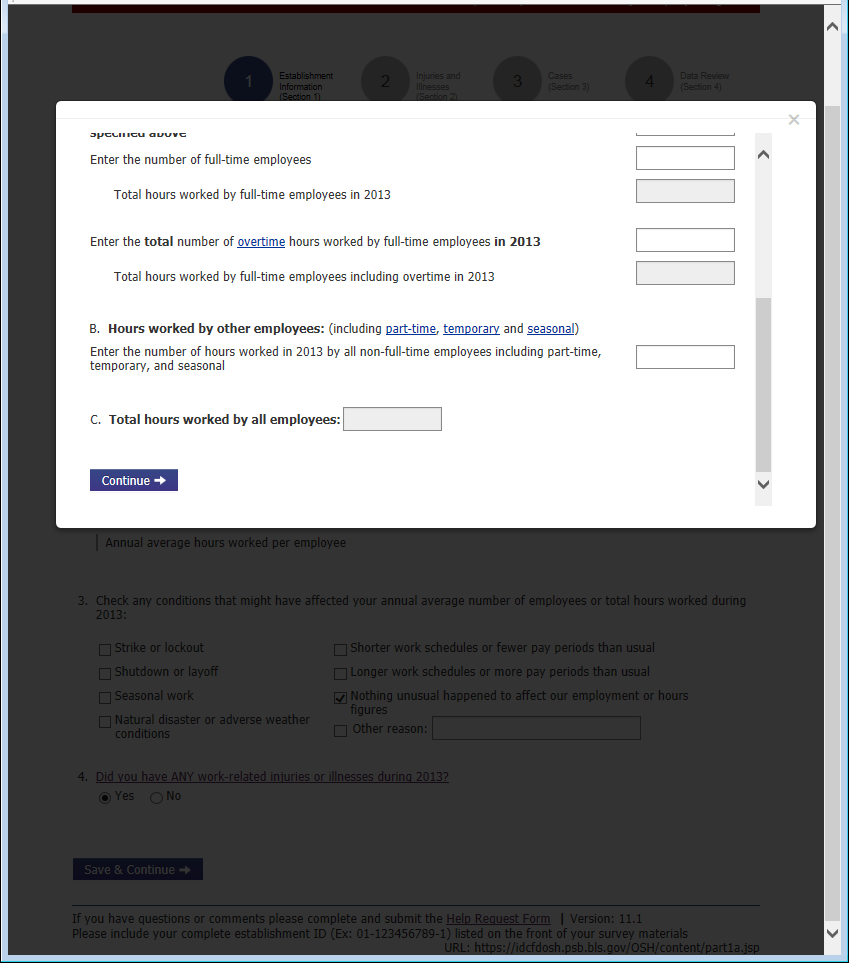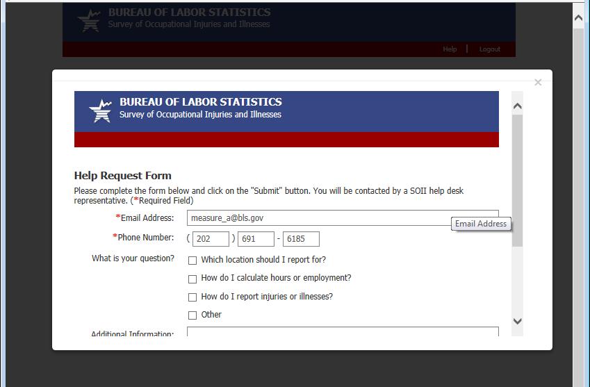 Previously the bottom of each page contained an email address for requesting assistance. Now it contains a link to a help form. This allows us to automatically route the help request to the appropriate party and gives us information about the page and the establishment the respondent was having trouble with. The 2 required fields, email address and phone number, are pre-populated with the information the respondent provided during the registration process.