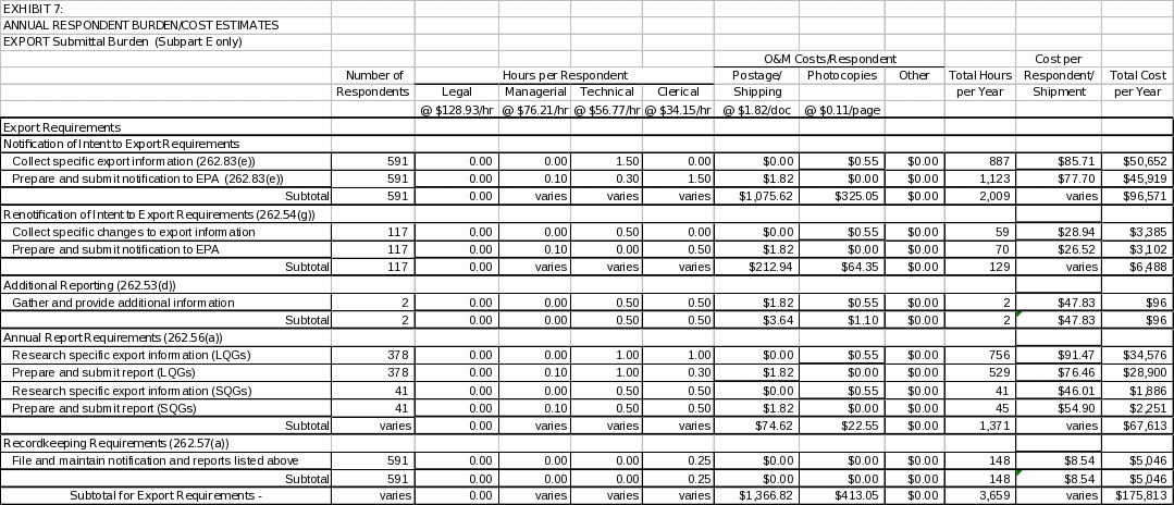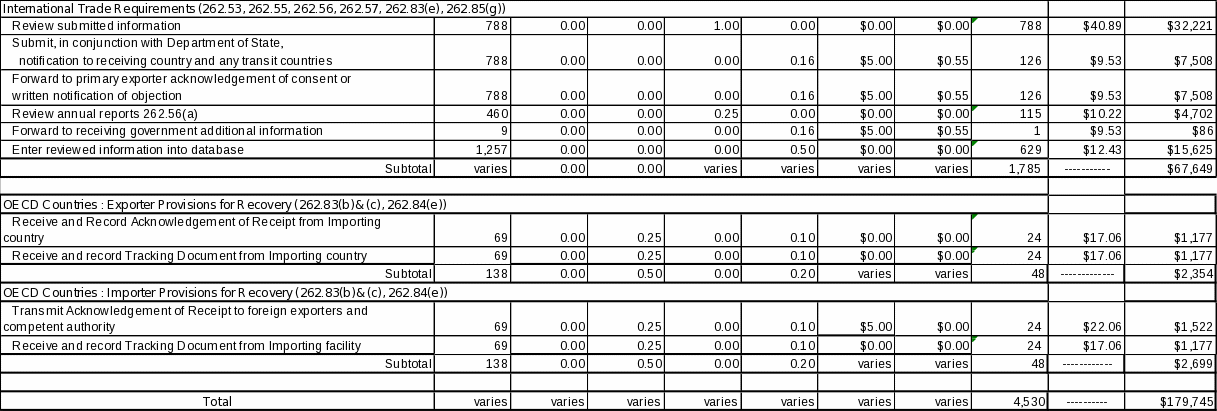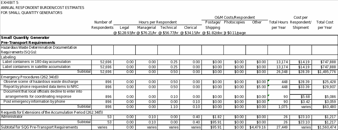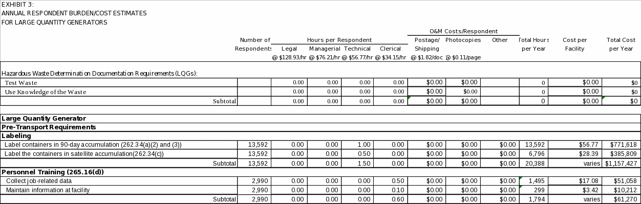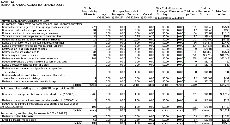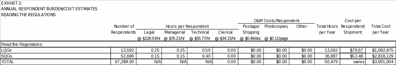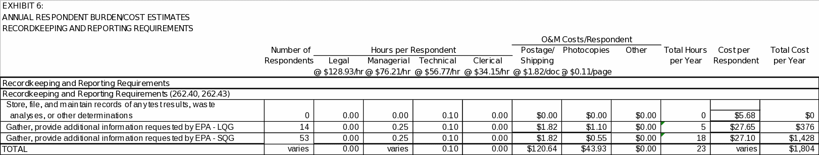 Based on the above assumptions, affected universes and associated labor and operating costs, EPA estimates that 253,519 burden hours and $14,674,934 will be required annually to support recordkeeping and reporting requirements for large and small quantity generators. EPA also estimates that the burden to the Federal Government will be 4,530 hours and an annual cost of $179,745.