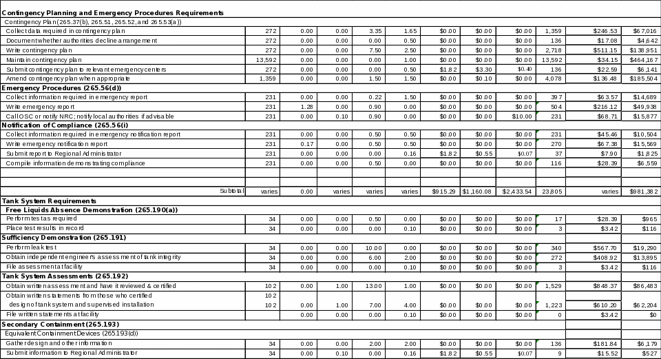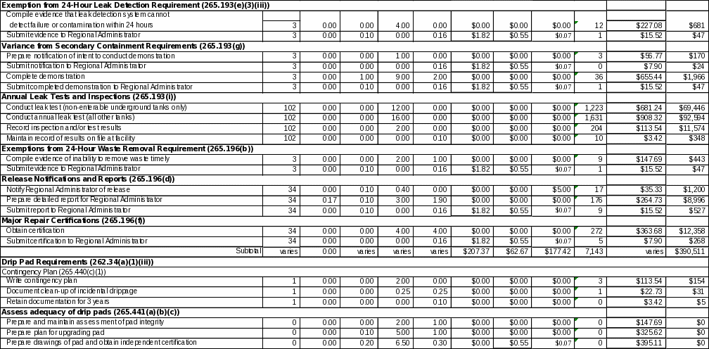 Depending on how the tank owner desires to comply with the regulations, he or she may need to submit one or more of the following: a no-free-liquids demonstration (§265.190(a)), existing tank system assessments (§265.191), an equivalent containment exemption (§265.193(d)), a variance from secondary containment requirements (§265.193(g)), or annual leak tests and inspections (§265.193(i)). Most LQGs seeking to operate under these conditions have already made the required demonstrations. In general, only LQGs recently subjected to hazardous waste regulations will need to perform these demonstrations. EPA estimates that approximately three percent or 102 respondents are subject to the leak tests and that one percent or 34 LQGs are subject to the other demonstration and testing requirements in sections 265.190 through 265.193.
