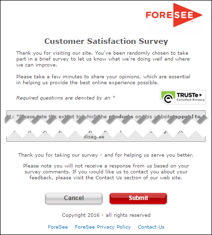 | This survey is conducted by an independent company ForeSee, on behalf of the site you are visiting. | This survey is conducted by an independent company ForeSee, on behalf of the site you are visiting. | ||||||