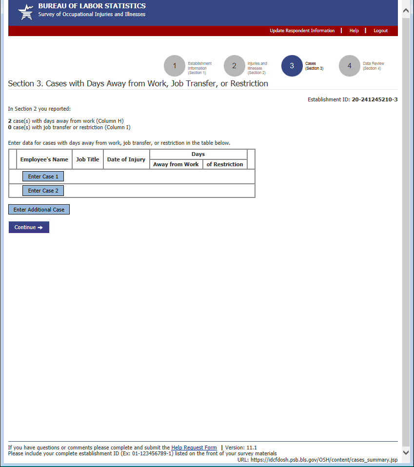 Unlike in previous years, the cases table is pre-loaded with empty case rows based on the respondent’s responses in Section 2 to visually prompt respondents to enter case details.