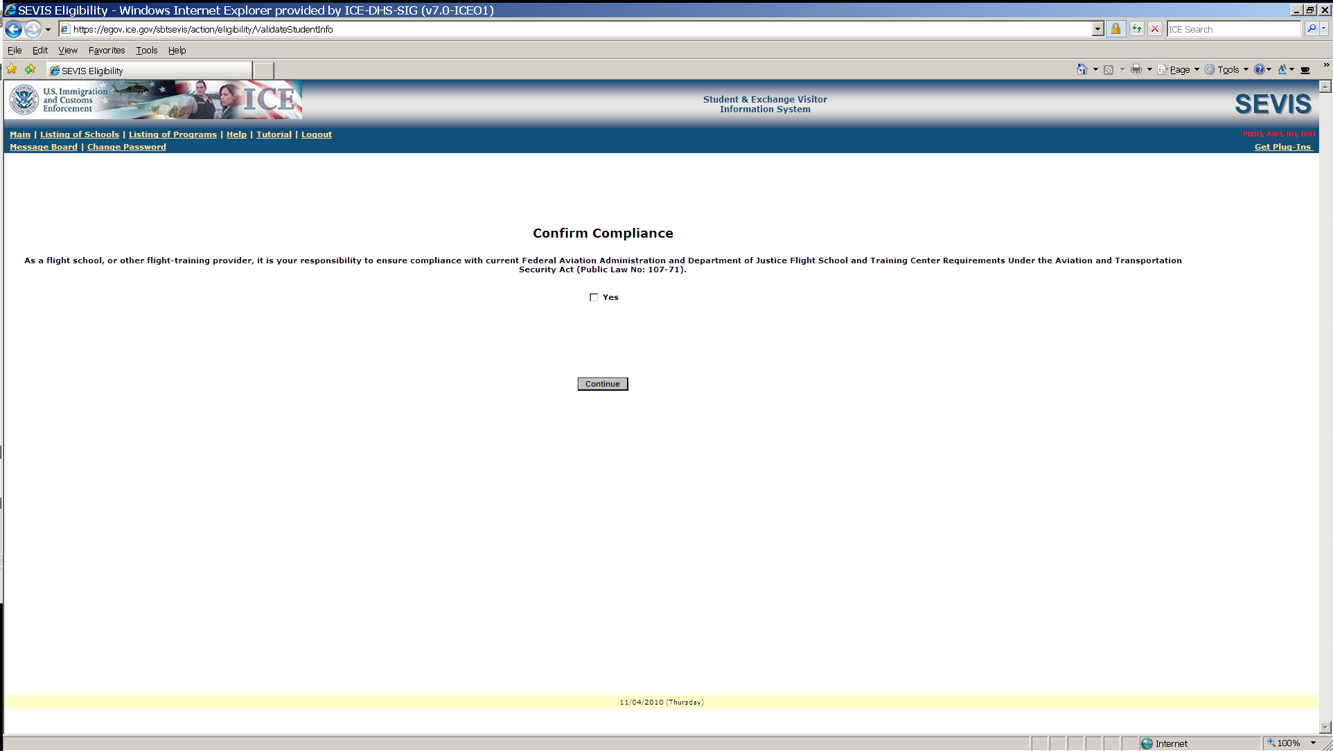 Screen requires affirmation of compliance with Federal Aviation Administration Flight School regulation. Designated school official must check the Yes box.
