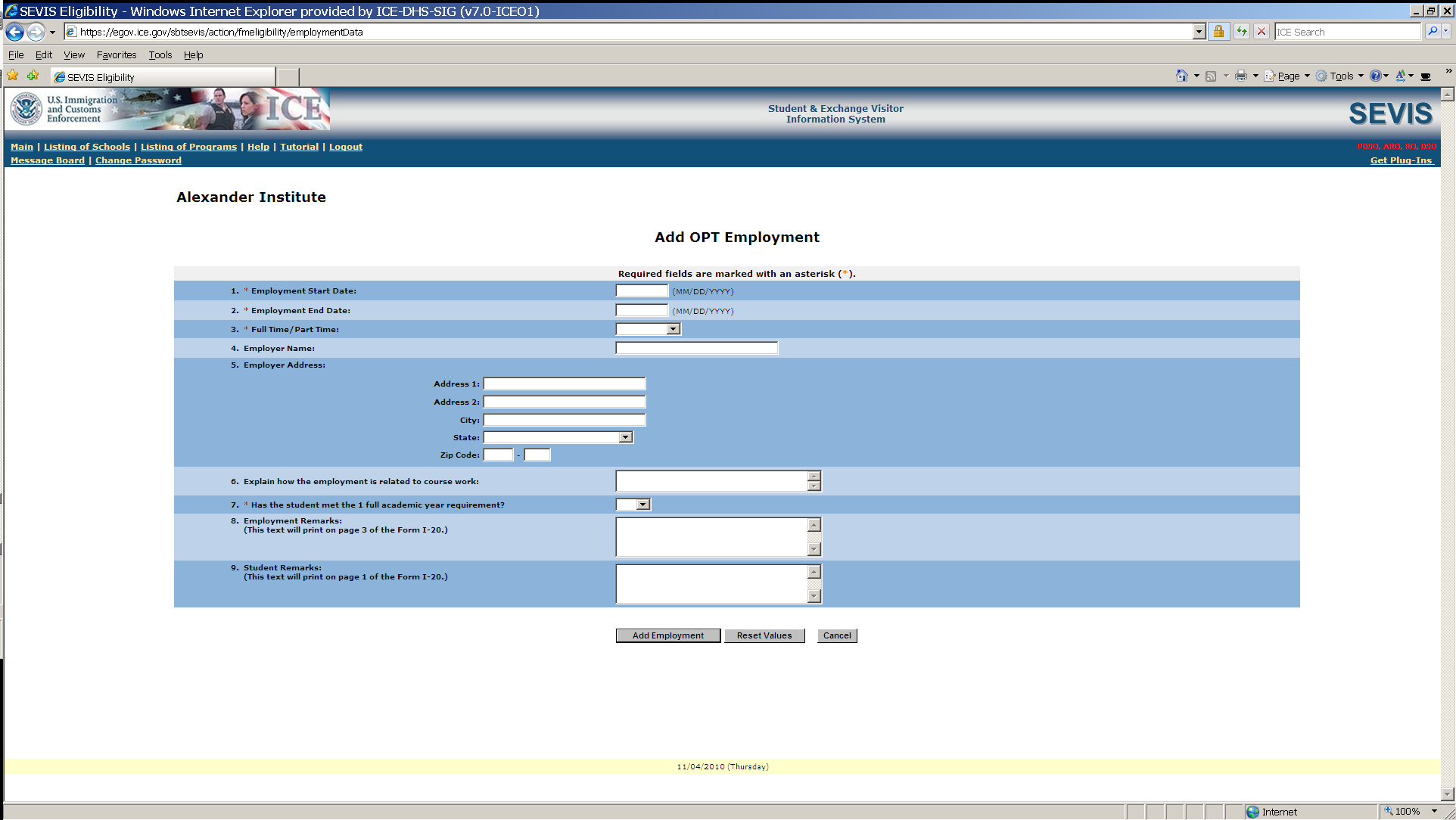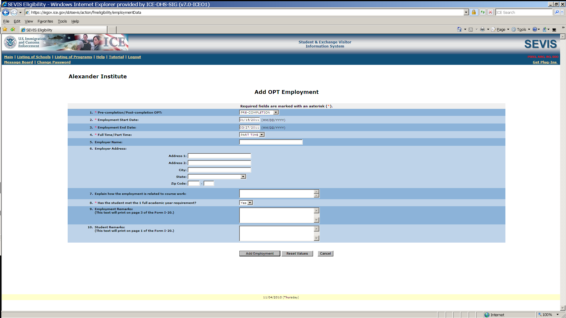 Add OPT Employment information to an M-1 Student SEVIS Record