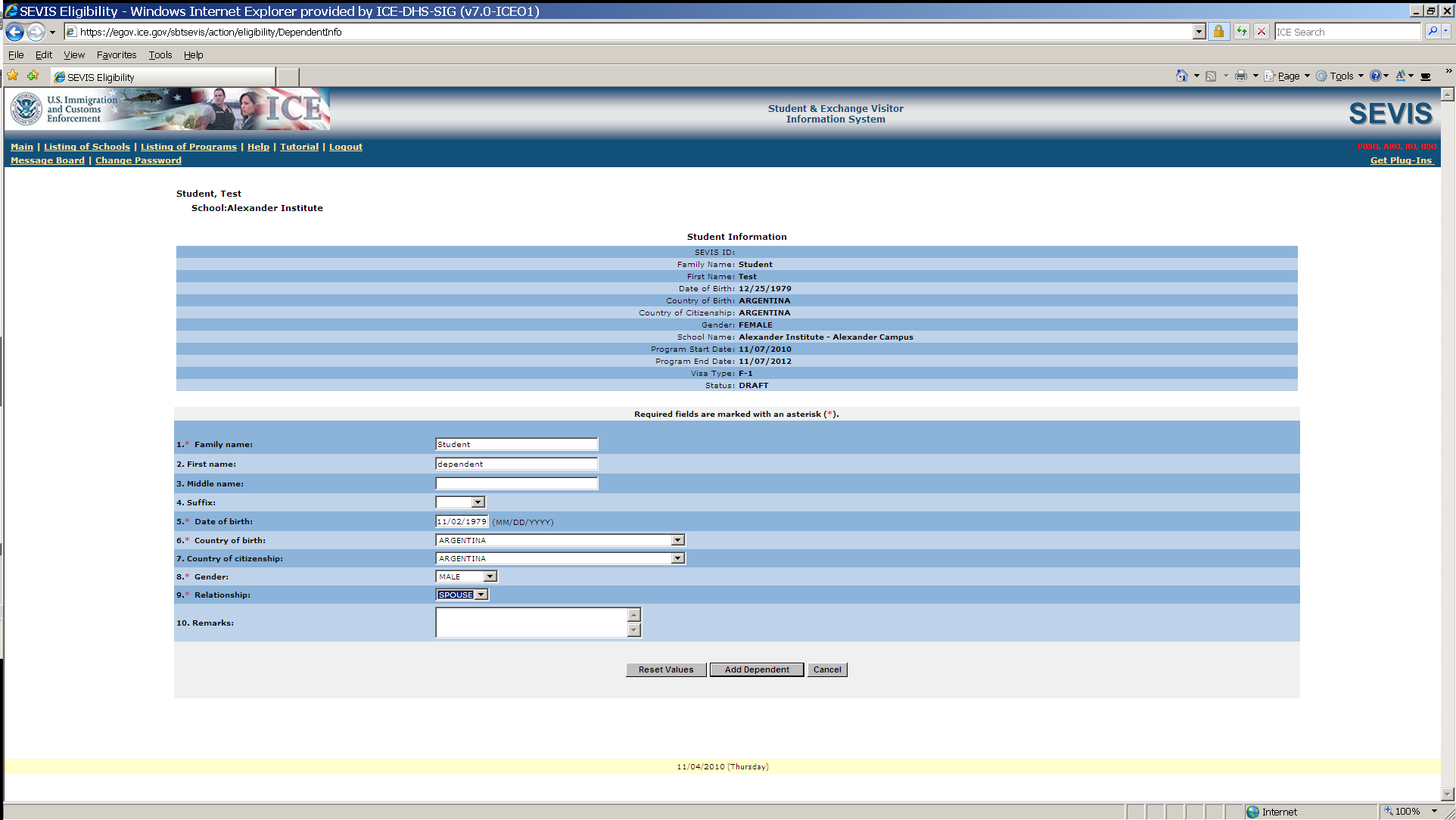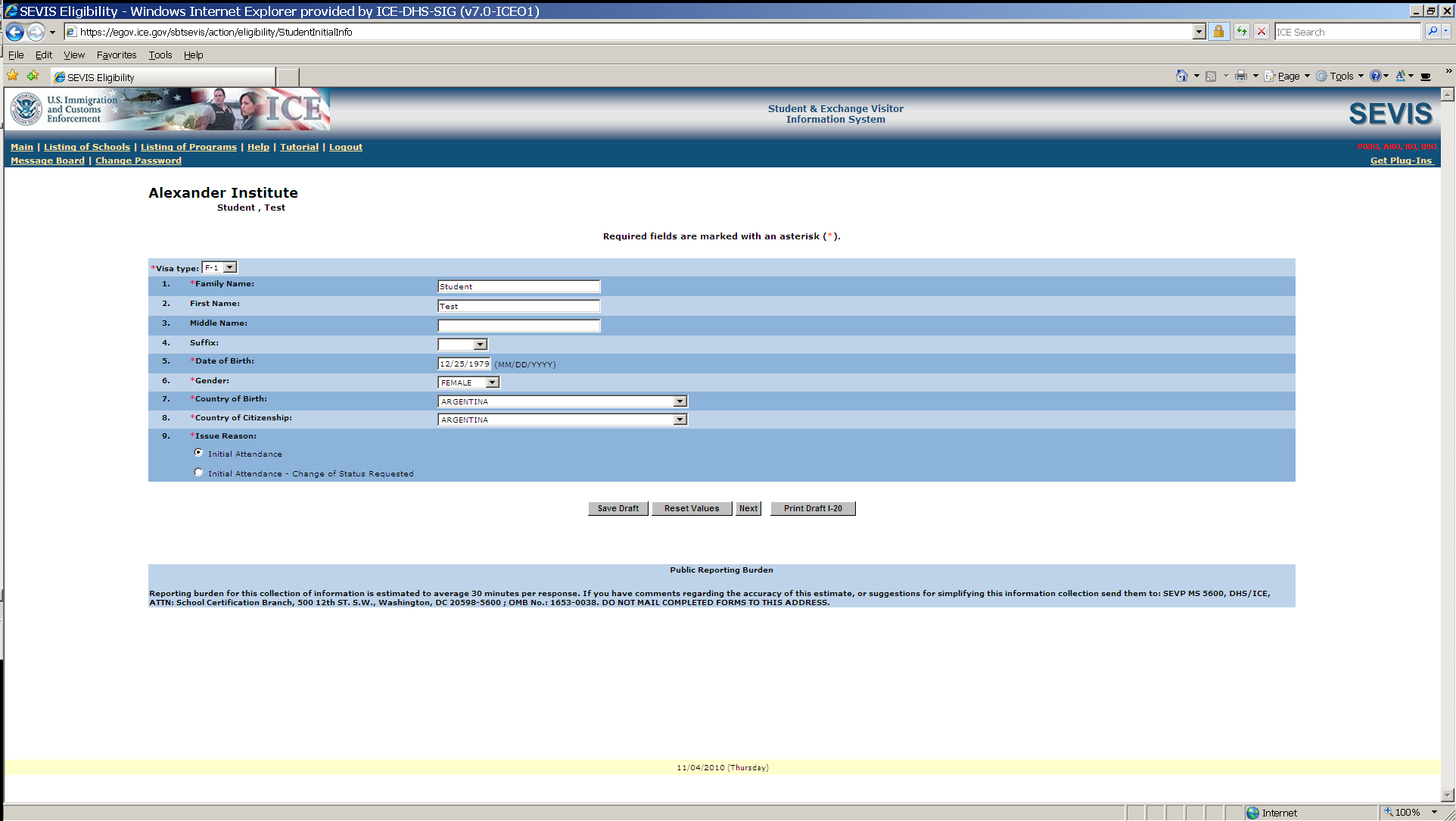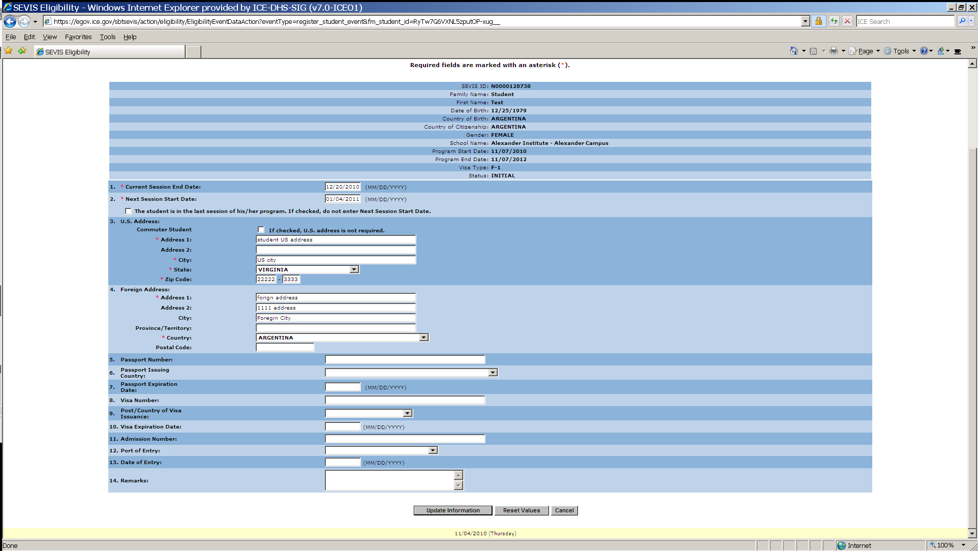 F-1student SEVIS Record Information Screen