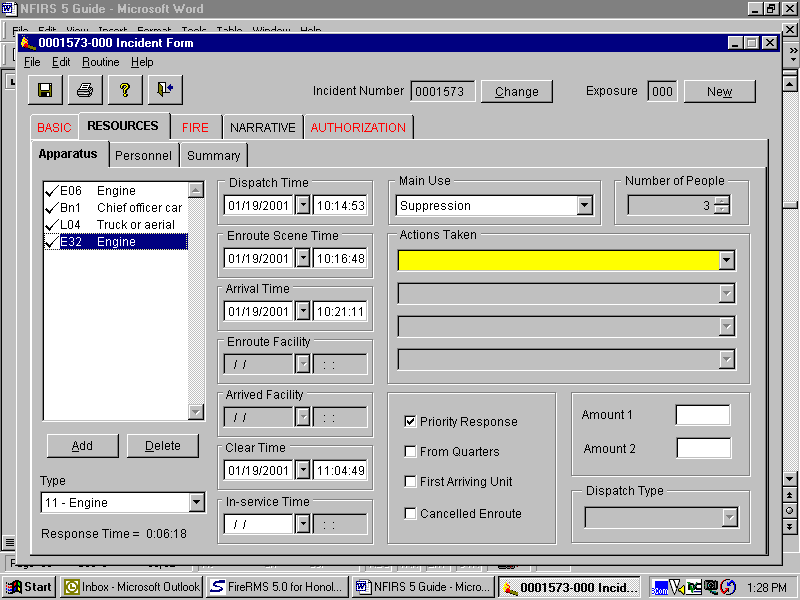 Actions Taken: CADS will not drop in action taken. List one or more actions that each specific company took. E.g., Bn 1—Incident Command, E01—Extinguish, etc. If two or more companies operate at an incident without a Battalion Chief, one of the two companies should identify who assumed “Incident Command.”