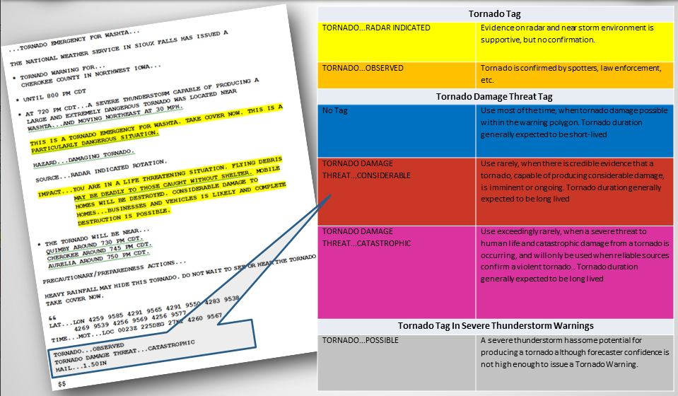 In the wake of the 2011 Joplin, MO, tornado—the deadliest to strike the United States since modern recordkeeping began in the 1950s—the NWS began considering ways to better alert the public to such dangerous weather event risks. The NWS Central Region conducted an experiment with five weather offices in Missouri and Kansas to test whether the incorporation of impact-based warning (IBW) information in tornado warnings helps people make faster decisions. Along with new wording, threat tags were attached to the warnings based on the severity of the situation (see illustration below). In 2013, the experiment was extended to 38 weather offices throughout 12 additional states within the NWS Central Region; this expansion continued in 2015 to include more offices in the Southern, Eastern, and Western Regions.