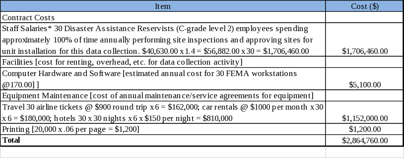 14. Provide estimates of annualized cost to the federal government. Also, provide a description of the method used to estimate cost, which should include quantification of hours, operational expenses (such as equipment, overhead, printing and support staff), and any other expense that would have been incurred without this collection of information. You may also aggregate cost estimates for Items 12, 13, and 14 in a single table.