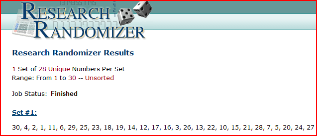 This means that the students corresponding to the above numbers in the list generated by random.org form Project X’s random sample. Looking at the random list of numbers generated, 8 and 9 are not present, meaning Students 28 and 10 (the students corresponding to 8 and 9 in the list) will not be part of the random sample, and thus, not tracked.
