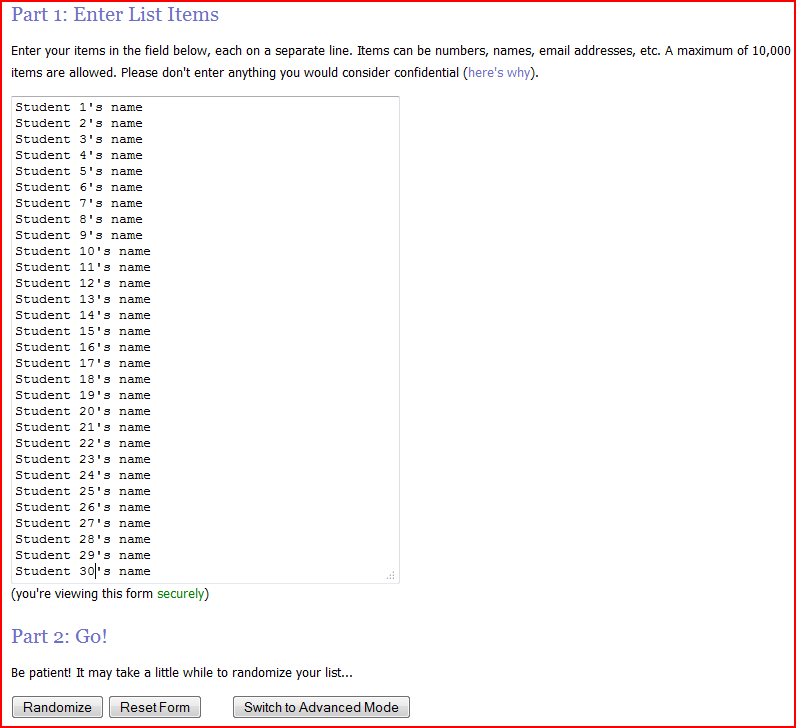 (Note: The site can be viewed securely by selecting “secure view” underneath the empty field in Part 1. This is highly suggested. For security reasons, do NOT use SSNs or birthdates to randomize the list of students.)