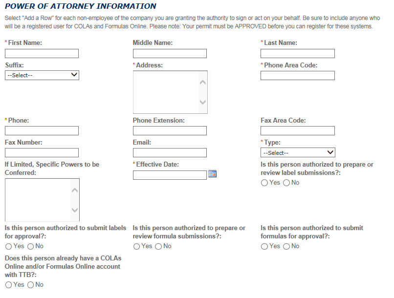 - Power of Attorney Information (OMB No. 1513-0014): This information collection is used by TTB to ensure that only duly authorized individuals are signing documents. The information is voluntary.