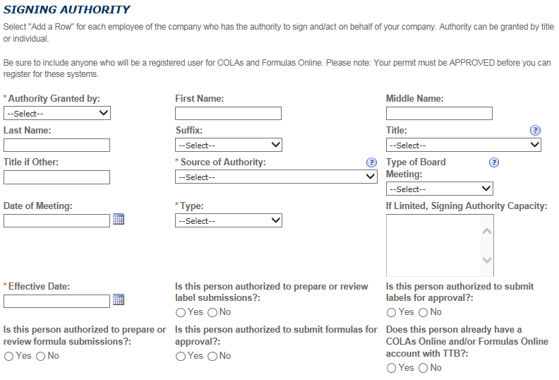 - Signing Authority Information (OMB No. 1513-0036): This information collection is used by TTB to ensure that only duly authorized individuals are signing documents. This information is voluntary.