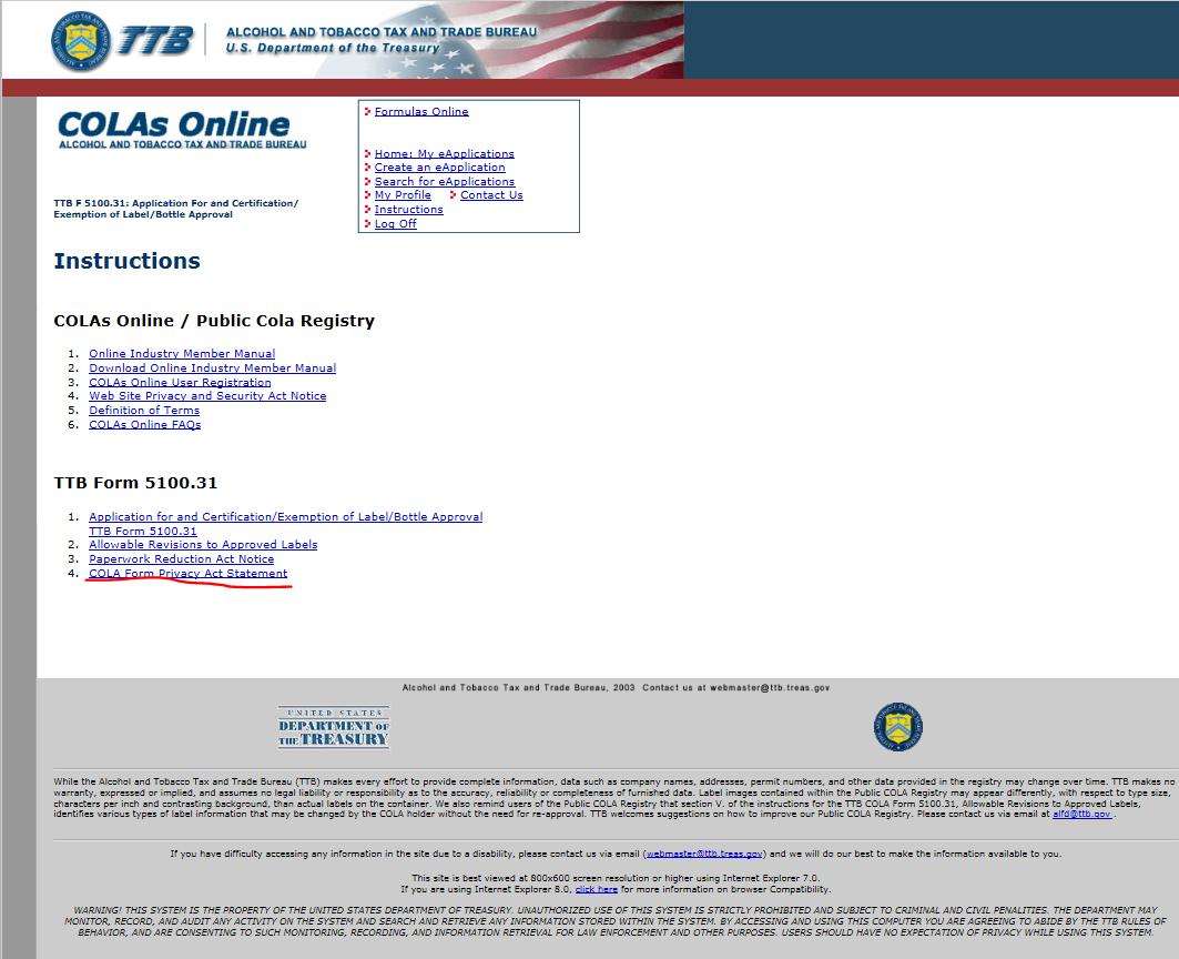 The COLA Form Privacy Act Statement shown above will be replaced with the “Disclosure Statement from the paper form, TTB F 5100.31, which reads as follows: