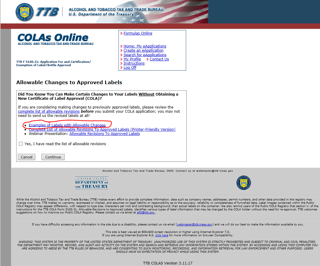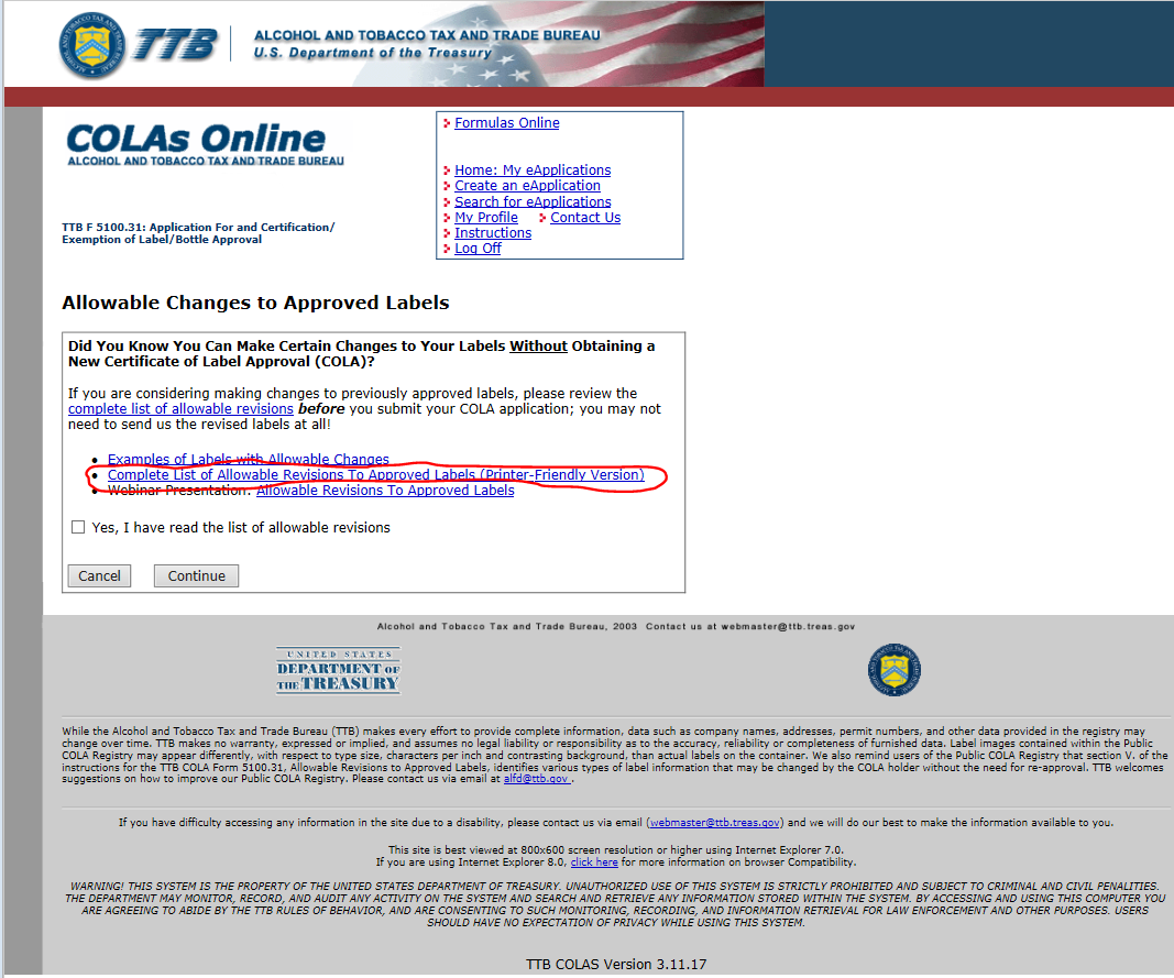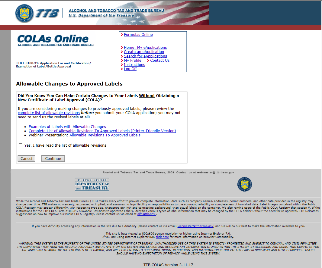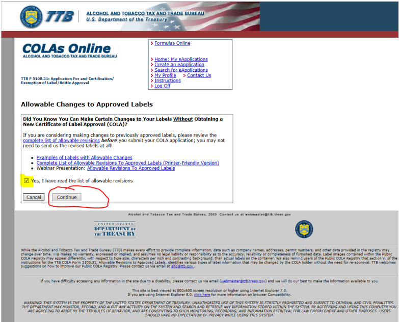 User must “Acknowledge” before proceeding! This insures that users have read the Allowable List of Revisions to approved Labels, and therefore do not apply for unnecessary COLAs.