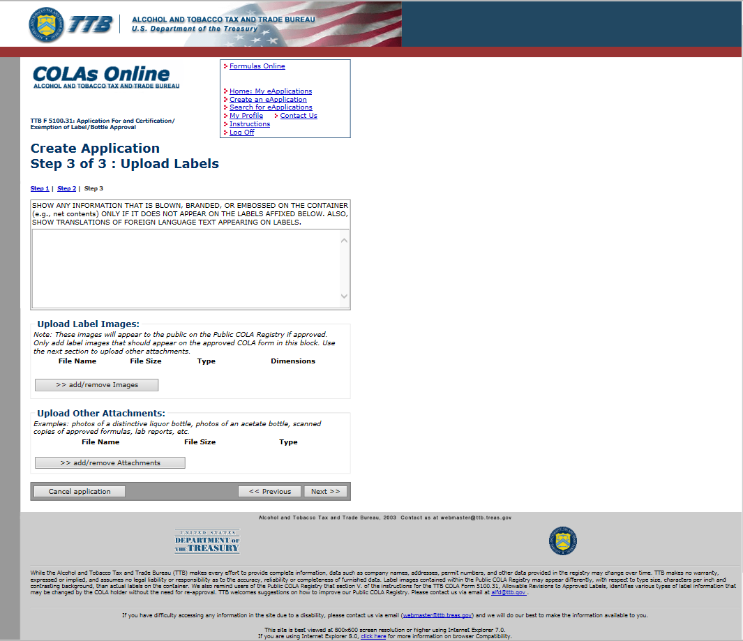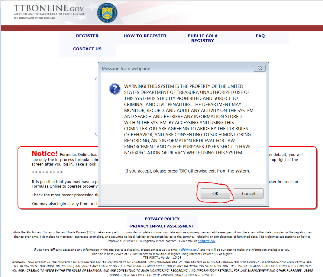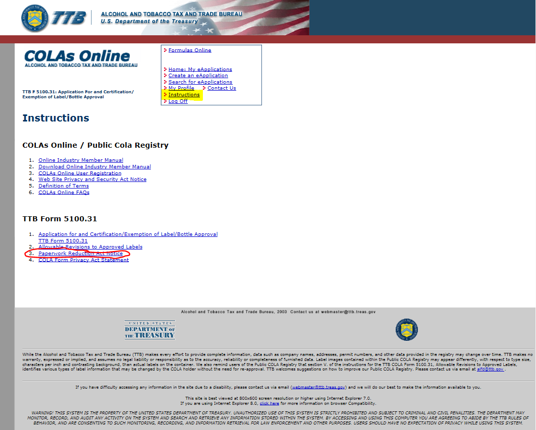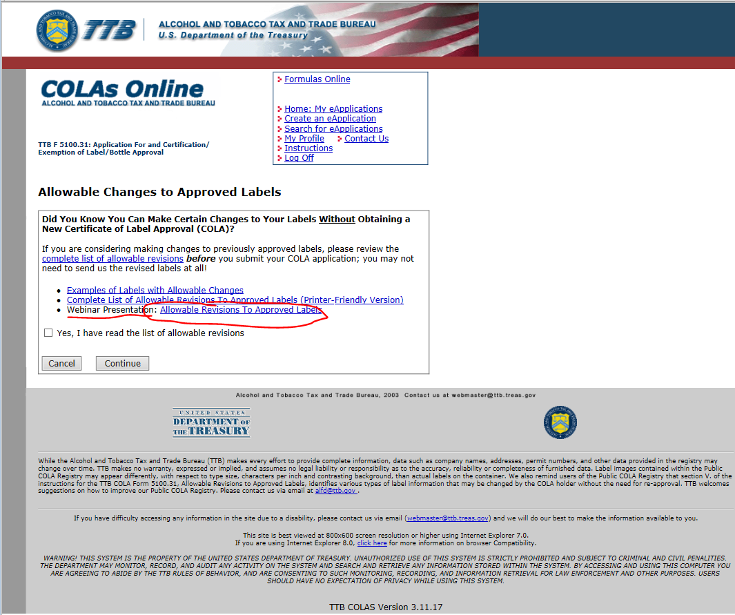 User must “Acknowledge” before proceeding! This insures that users have read the Allowable List of Revisions to approved Labels, and therefore do not apply for unnecessary COLAs.