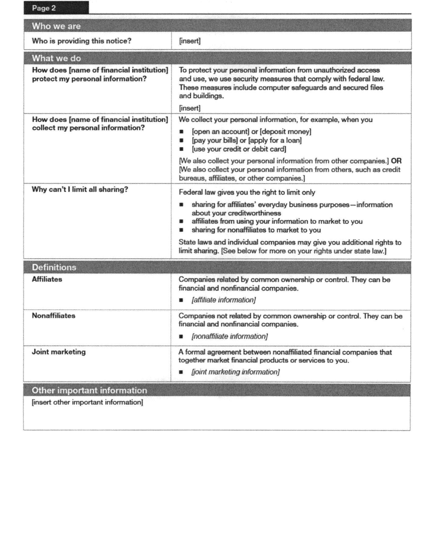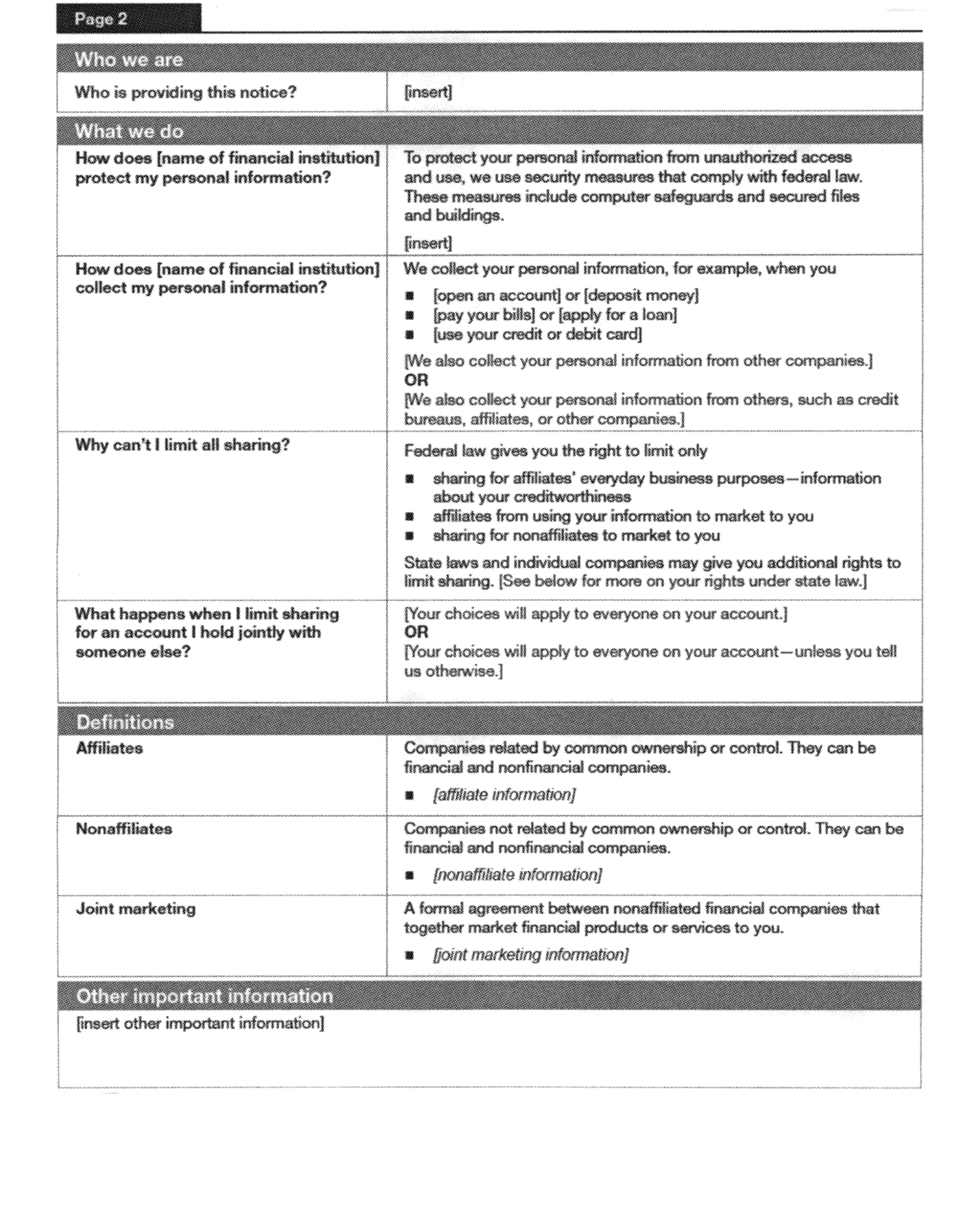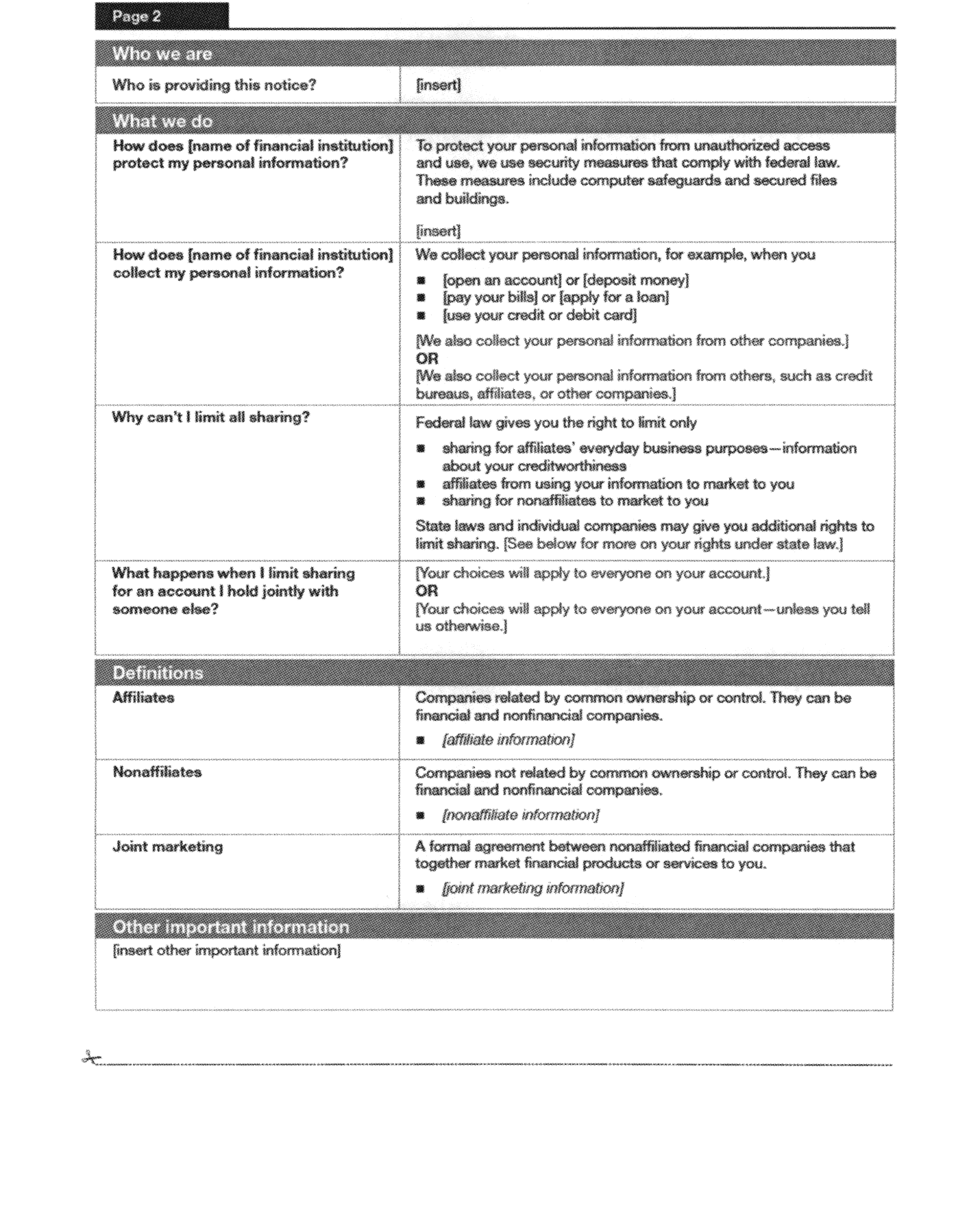 Insert the name of the financial institution providing the notice or a common identity of affiliated institutions jointly providing the notice on the form wherever [name of financial institution] appears.