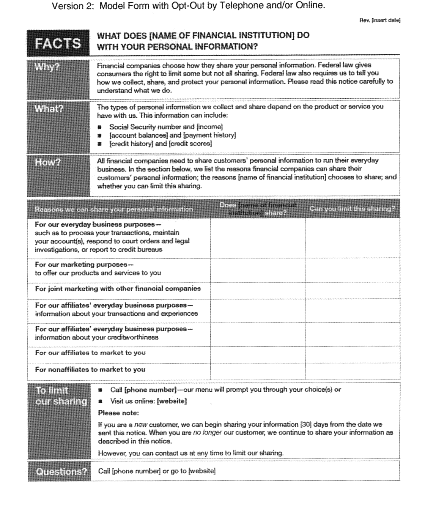 (e) To limit our sharing: A financial institution must include this section of the model form only if it provides an opt-out. The word “choice” may be written in either the singular or plural, as appropriate. Institutions must select one or more of the applicable opt-out methods described: telephone, such as by a toll-free number; a website; or use of a mail-in opt-out form. Institutions may include the words “toll-free” before telephone, as appropriate. An institution that allows consumers to opt out online must provide either a specific Web address that takes consumers directly to the opt-out page or a general Web address that provides a clear and conspicuous direct link to the opt-out page. The opt-out choices made available to the consumer who contacts the institution through these methods must correspond accurately to the “Yes” responses in the third column of the disclosure table. In the part titled “Please note,” institutions may insert a number that is 30 or greater in the space marked “[30].” Instructions on voluntary or state privacy law opt-out information are in paragraph C.2(g)(5) of these Instructions.