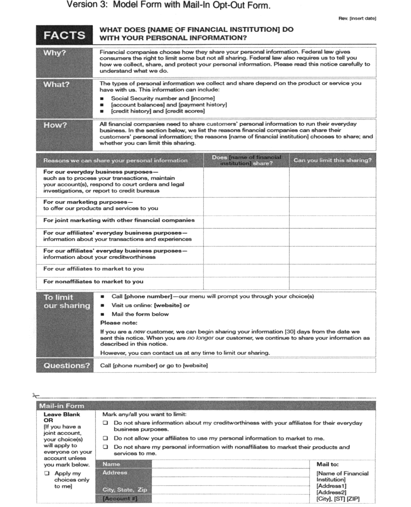 (g) Mail-in opt-out form. Financial institutions must include this mail-in form only if they state in the “To limit our sharing” box that consumers can opt out by mail. The mail-in form must provide opt-out options that correspond accurately to the “Yes” responses in the third column in the disclosure table. Institutions that require customers to provide only name and address may omit the section identified as “[account #].” Institutions that require additional or different information, such as a random opt-out number or a truncated account number, to implement an opt-out election should modify the “[account #]” reference accordingly. This includes institutions that require customers with multiple accounts to identify each account to which the opt-out should apply. An institution must enter its opt-out mailing address: in the far right of this form (see version 3); or below the form (see version 4). The reverse side of the mail-in opt-out form must not include any content of the model form.