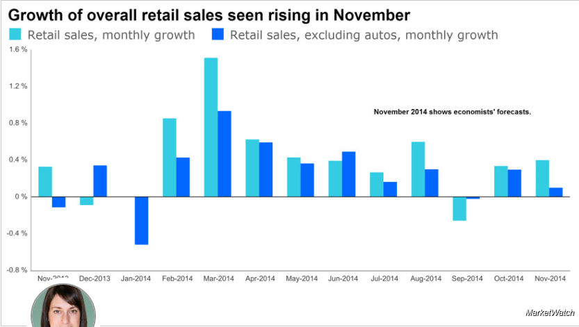 Growth for retail sales likely picked up in November to hit the fastest pace in three months, according to analysts' forecasts for data to be released Thursday. Economists polled by MarketWatch expect the government to report that retail-sales growth rose to 0.4% last month, boosted by autos, compared with 0.3% in October. Excluding autos, economists forecast that retail sales rose 0.1% last month, hit by falling gasoline prices, compared with 0.3% in October.9