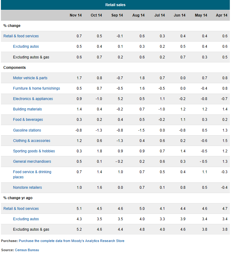 U.S. retail sales rose 0.7% in November, the fastest growth in eight months, supported by autos, clothing and purchases at other kinds of stores, as holiday shopping got underway, according to government data released Thursday. Economists polled by MarketWatch had expected November growth of 0.4%, compared with October's originally reported increase of 0.3%. On Thursday, the U.S. Commerce Department revised October's growth to 0.5%. Auto sales rose 1.7% in November, the strongest result since August. Excluding autos, retail-sales growth hit 0.5% last month, the strongest result since June. Economists had expected sales excluding autos to rise 0.1% in November, compared with an originally estimated increase of 0.3% in October. On Thursday, the government revised October's growth for non-auto retail sales to 0.4%. Retail sales are an important part of consumer spending, which is the backbone of the U.S. economy. Retail sales have increased 5.1% over the past 12 months.26