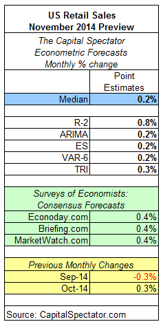 US retail sales are expected to rise 0.2% in tomorrow's November report vs. the previous month, according to The Capital Spectator's median point forecast for several econometric estimates. The median prediction reflects a slight deceleration in growth vs. the previous month's 0.3% advance.3