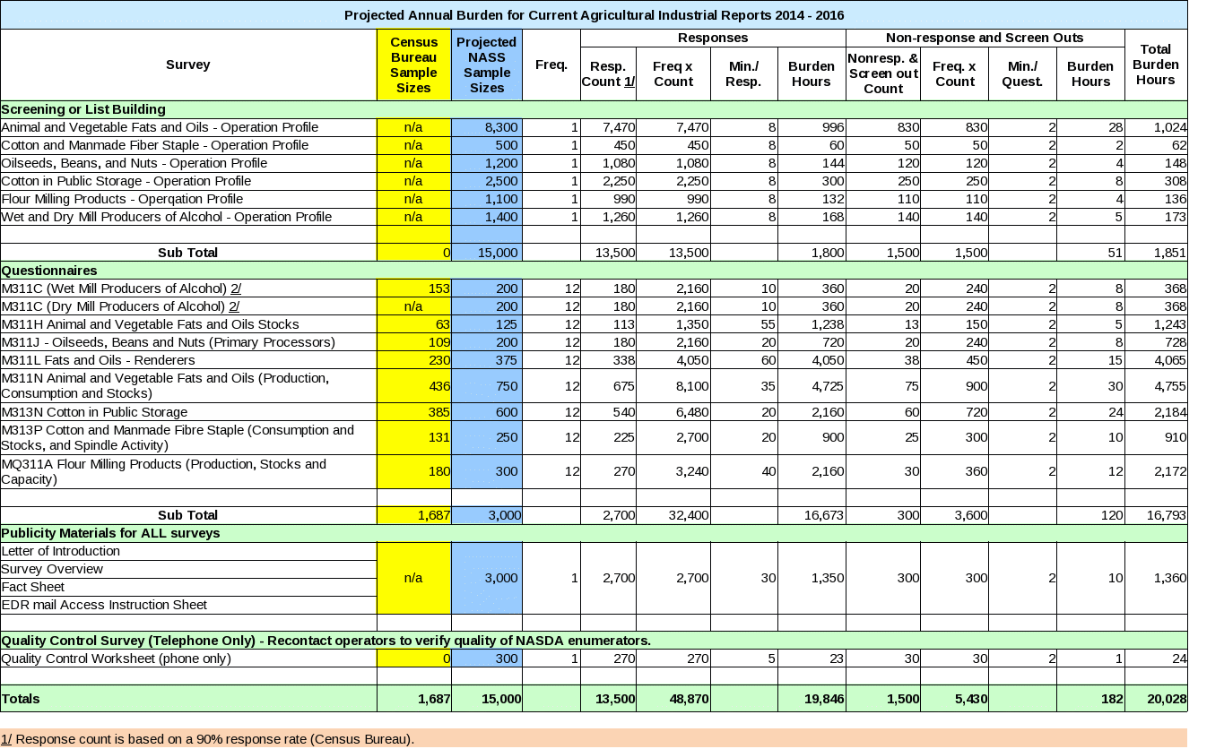 The US Census Bureau has collected and reported data for some of the Current Industrial Reports for over 100 years. In 2012 they discontinued the full scope of these surveys due to budget cuts. These previous industrial reports included a wide range of surveys that included commodities from the following commodity groups: agriculture, aerospace, appliances, pharmaceuticals, textiles and many more. NASS is requesting the authority to reinstate eight data collection instruments previously used by the Census Bureau that cover the commodity groups of fats and oils (production, consumption, stocks and oilseed crushings), flour milling, and cotton consumption and stocks. NASS will also be separating the ethanol production questionnaire into a wet mill and a dry mill version and expanding the scope of it to include all types of alcohol for a total of nine data collection instruments. In addition NASS will be adding a profiler/screener questionnaire that consist of six versions and will be used to determine which questionnaire(s) will be sent to each organization included in the final sample.