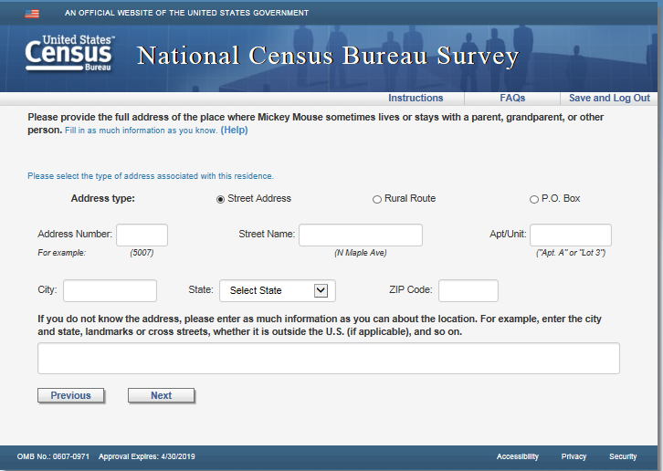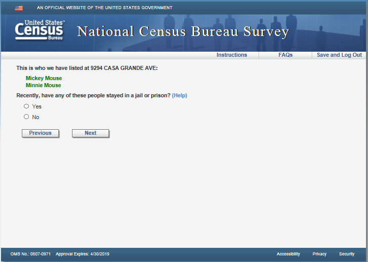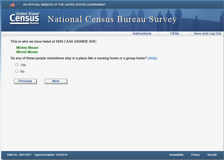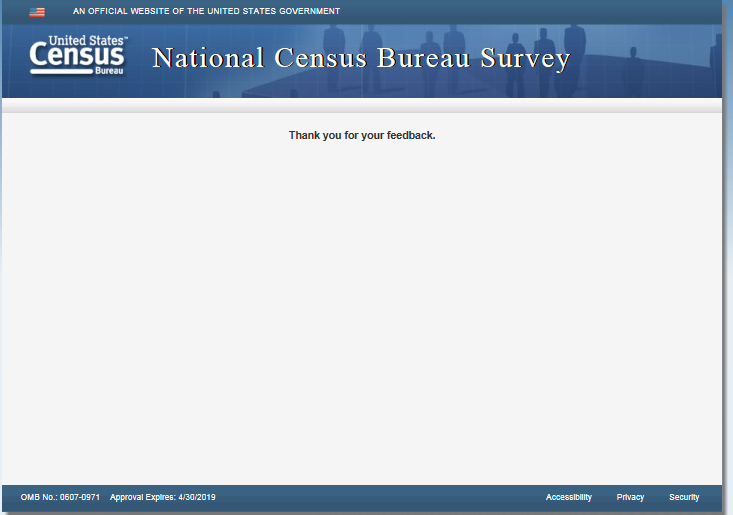 The National Census Bureau Survey provides information to study a variety of new methods and advanced technologies that are under consideration for the 2020 Census. This is an ongoing survey conducted approximately four times a year. We appreciate your interest in this survey, but we will no longer be processing responses to this survey for the current data collection period. Thank you.