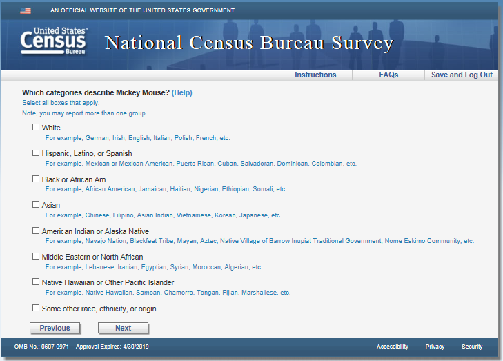Version 2: Remove all instruction text…“Select all boxes that apply.” “Note, you may report more than one group.” And all the examples under the race categories.