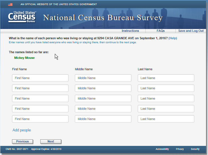 Version 2: Remove text “Enter names until you have listed everyone who was living or staying there, then continue to the next page.”