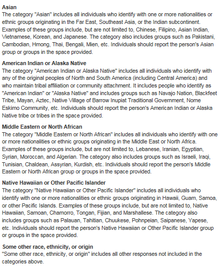 Version 2: Remove blue instruction text “Select all boxes that apply and/or enter categories in the space below. Note, you may report more than one group.” and “Enter, for example, Pakistani, Cambodian, Hmong, etc.”