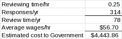 The average hourly wage is based on OMB Circular A-76 guidance for quantifying the cost of efforts: (1) the complexity level was deemed to be at the GS-12/5 level, so the fiscal year 2015 hourly rate was applied to the estimated hours; and (2) a 36.25% fringe and overhead burden was added to the hourly rate.