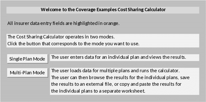 On the WELCOME worksheet, which displays when the tool is opened, the user will select either the Single Plan Mode or the Multi-Plan Mode.
