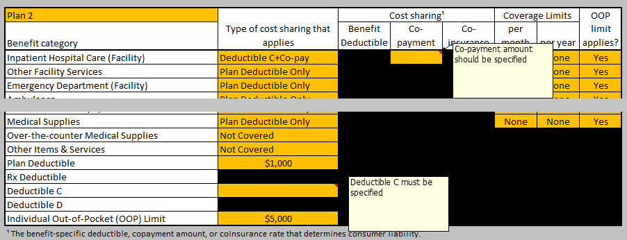 The CECSC output data file consists of a tab-separated text file containing 19 variables. These correspond to the data that are generated and stored on the PLAN_OUTPUT_DATA worksheet. The outputs from the CECSC can be used to populate the Deductibles, Copayments, Coinsurance, Limits or Exclusions, and Total [patient] would pay is sections of the coverage example in the SBC.