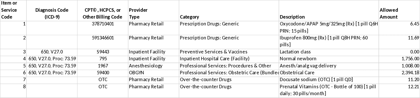 The MATERNITY_LINE_ITEM worksheet which shows the allowed amount for each of the items and services that are included in the coverage example.