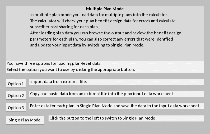 In the Multi-Plan Mode a user imports (or copies) data from an external file for a set of plans and then runs the calculator to produce an output file. In Multi-Plan Mode a user can also browse and review the results for each plan before creating the output file.