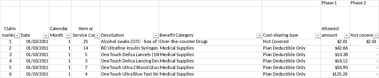 The DIABETES_TIMELINE worksheet which shows the claim-by-claim development of the consumer cost sharing amount.