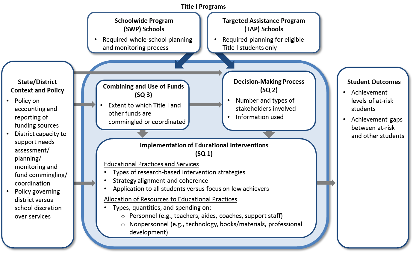 These policy provisions are intended to enable SWPs to design the types of educational programs that, according to decades of research on school improvement, are more likely to benefit students. Studies from the 1980s onward have identified characteristics associated with schools that are successful (particularly for disadvantaged students): shared goals, positive school climate, strong district and school leadership, clear curriculum, maximum learning time, coherent curriculum and instructional programs, use of data, schoolwide staff development, and parent involvement (Desimone, 2002; Fullan, 2007; Purkey & Smith, 1983; Williams et al., 2005). The extent to which SWP and TAP schools use Title I funds to support these kinds of practices—designing coherent whole-school programs with these characteristics, identifying and comingling or coordinating multiple funding streams, and selecting appropriate interventions and practices—is the focus of this study.