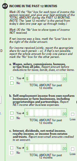 Respondent burden: Explore the effects of this question format on respondent burden. This research goal is not mutually exclusive from the others. We believe that omitting the requirement to report income amounts for question 47 will reduce respondent burden, but if this makes it more difficult to calculate total income and if the revised instructions are more cumbersome, then the main goal of this research was not met.