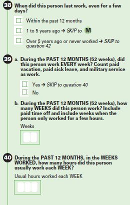 * There is normally a skip instruction here. If respondents choose this option, they skip over the hours worked and weeks worked questions. However, because we changed the reference period to be the last calendar year instead of the last 12 months, some people in this category should get the weeks worked and hours worked questions. To resolve that issue, we are removing the skip instruction for this round of cognitive testing. We recognize that by doing so, some people who did not work in 2015 will now get these questions. For the CAI mode for this testing, we could create an instruction for the interviewer to skip the Weeks Worked and Hours Worked questions if the respondents mention that the last worked between 2010 and 2014. Westat could also focus the recruiting effort on those who worked in 2015 or sooner and those who last worked 5 years ago or never worked. If testing shows this reference period as a positive change, we will come up with a better solution for question 38.