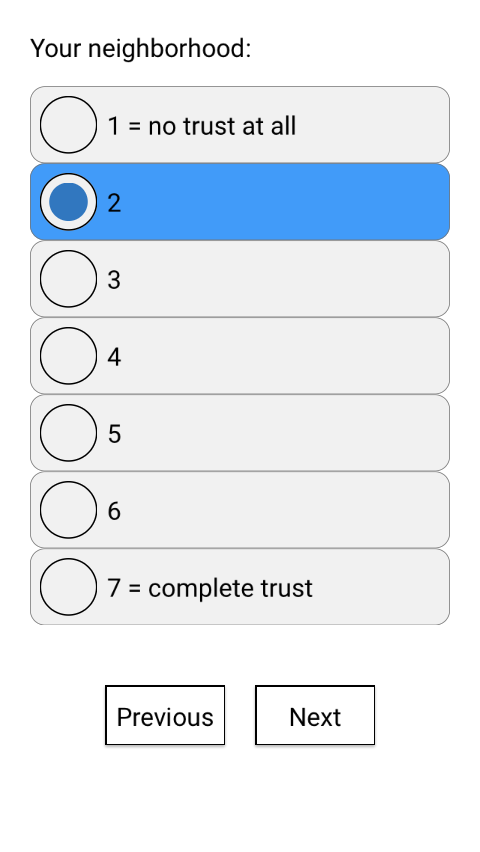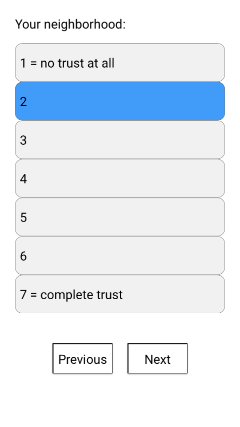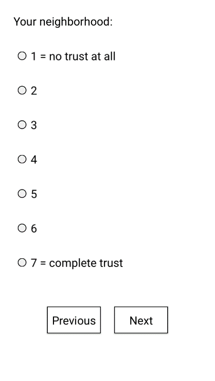 Each questionnaire has 9 questions.The items were adapted from the World Values Survey. They are shown in Appendix B. Example screen designs are shown in Appendix C.