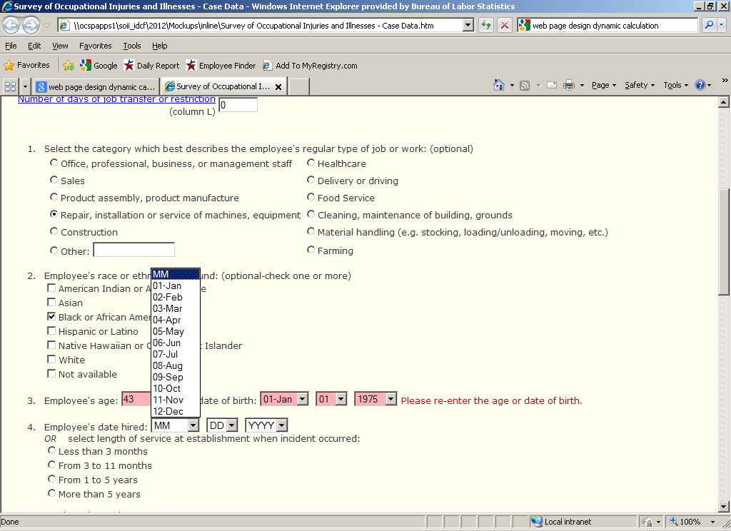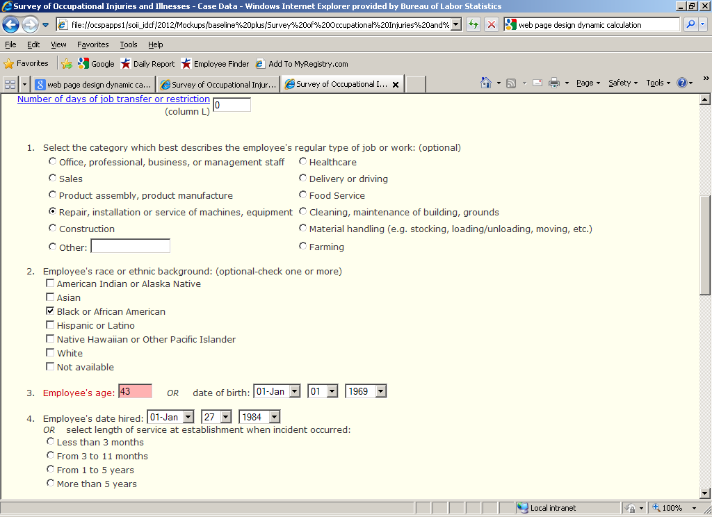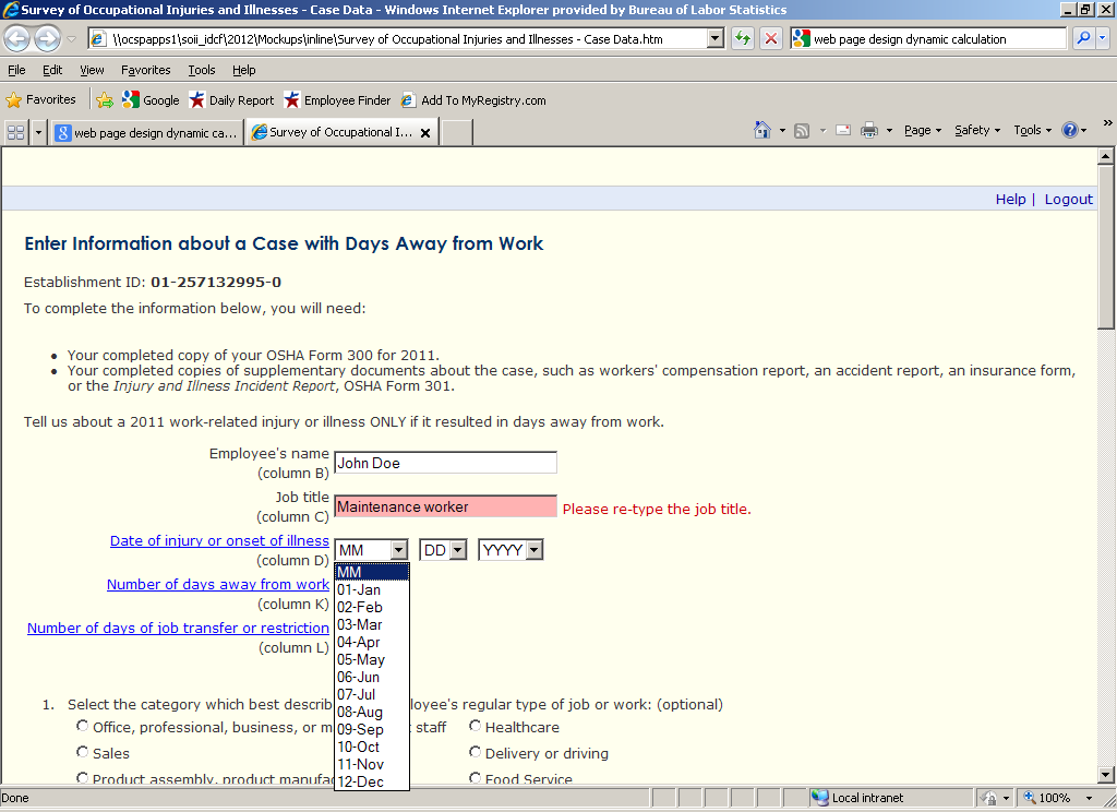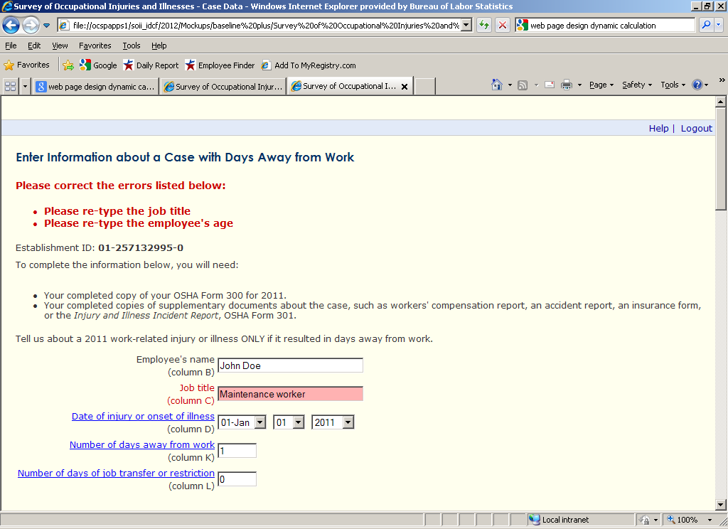 Participants were asked to enter in information about the second case resulting in days away from work, and again were told that they could make up their answers for the required fields. The only difference between Task 3 and Task 4 was in how the edit messages were displayed (see below for more details).