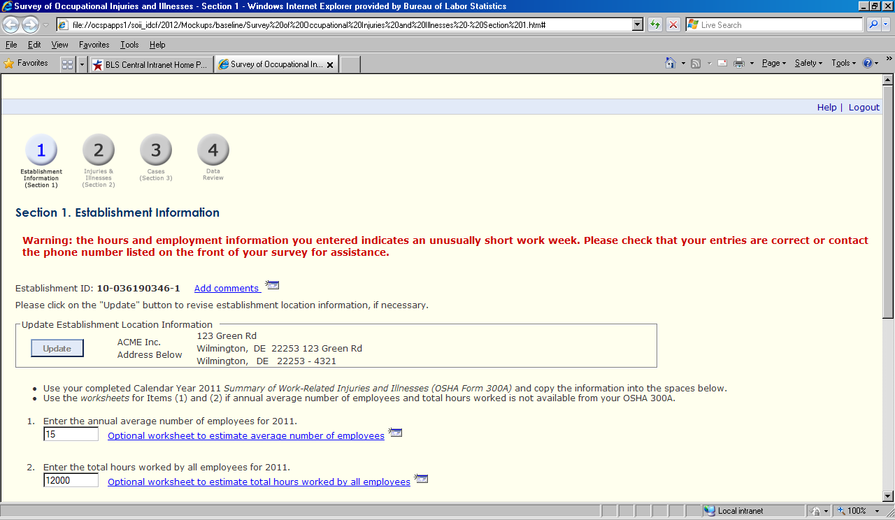 Prior to their test date, participants were sent hard copies of a blank 2011 SOII form and the OSHA Form 300 so that they would be familiar with the general SOII reporting requirements and format. Individuals were notified in advance that the BLS was in the process of redesigning its SOII reporting website, and that they would be helping to evaluate the proposed changes. They were told that this was a test of the site, not of them, and that they would not be asked to report data for an actual establishment.