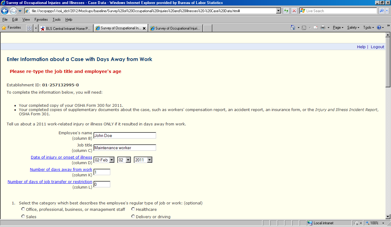 In this task, you’ll report details about the 2nd case that resulted in days away from work. Recall that the injury kept the employee away from work for 2 days. Again, for this task you will not be using the OSHA/SOII forms – you should make up answers for any questions on the page that require a response. We only are interested in how easy or difficult it is for people to navigate through the website and provide the information necessary for completing the survey.