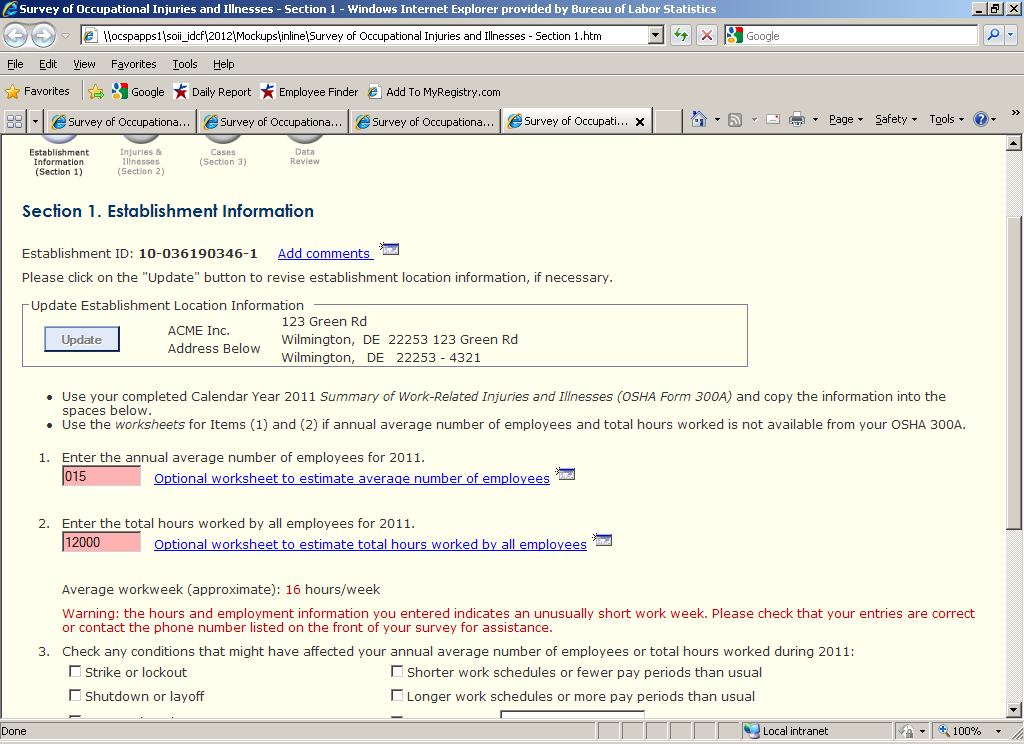 Finally, we noted that a number of participants thought that the Section 1 page was too crowded. This may be a testing artifact. Our study participants were given two pieces of information to report on that page (‘average annual number of employees’ and ‘total hours worked by all employees’), but were not provided with any additional information about the (fictional) establishment, or with survey forms referenced in Section 1. It therefore is understandable that some participants might find the content preceding the two relevant entry fields unnecessary or overwhelming. However, the page does contain a lot of text that the user is expected to digest, and the eye-tracking data from in this study (and past usability findings, generally) suggest that people often do not read this amount of text carefully. Anything that can be done to make the page appear less cluttered would likely improve its usability. One approach would be break up the current Section 1 page into two separate pages – one where users can review and update their Establishment Information, and another specifically for entering employees, hours, and summary case data.